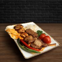Ein spezieller Mix für drei Personen aus Chicken Wings, Adana Kebap, mariniertem Lammspieß, Hähnchenspieß, türkischer Knoblauchwurst, würzigen Champignons und ein Mix aus vier hausgemachten Dips